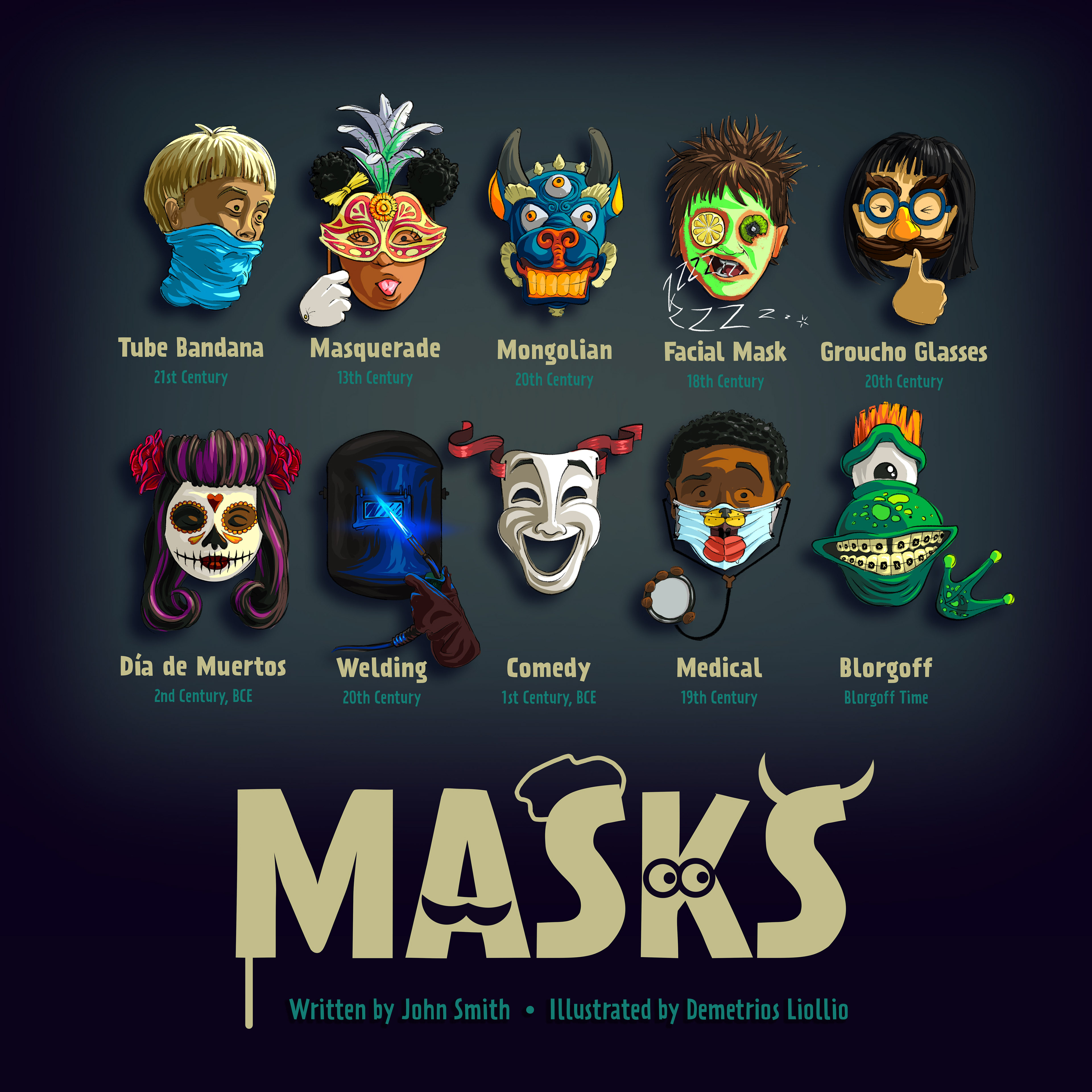 Mock Cover Illustration for an illustrated narrative non-fiction graphic novel about the history of masks (with a fictional host character named Blorgoff)